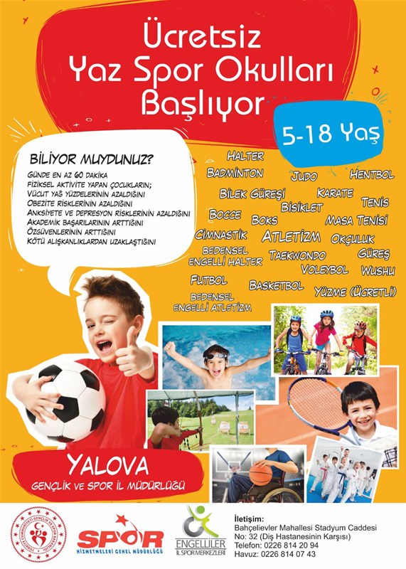 İlimizde yaklaşık 24 farklı branşta ve engelli spor branşlarında , 5-18 yaş arasındaki gençler için ücretsiz Yaz Spor Okulları açıldı.